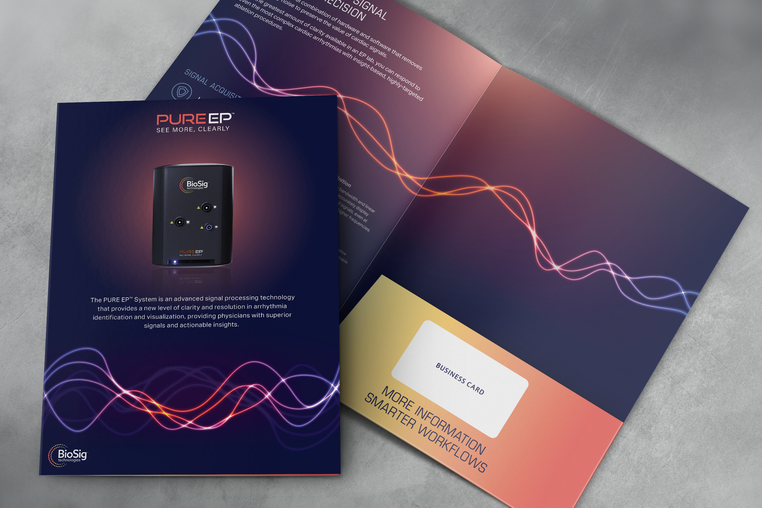 An updated visual product identity was essential to support BioSig’s audience expansion. We created a look and feel based on the new BioSig corporate brand, but tailored it specifically for the PURE EP audience of electrophysiologists by using darker colors and product-specific visual elements.